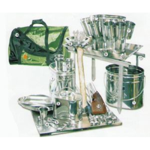 В комплект входит: 3 котелка с крышками (8,5 литров+6,5 литров+5,5 литров); чайник с чехлом (2,2 литра); 6 ложек; 6 вилок; 6 рюмок; 6 кружек; 6 чашек; 1 половник; 6 шампуров (длина 45см); таганок походный в чехле; противень или противень-коптильня; топор и сумка-чехол. Весь комплект упаковывается в сумку.