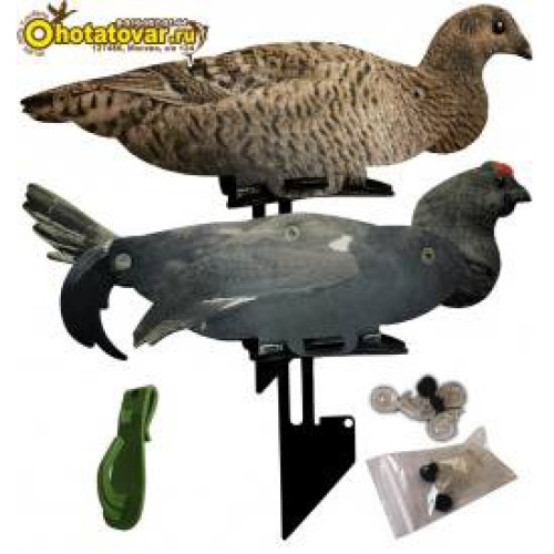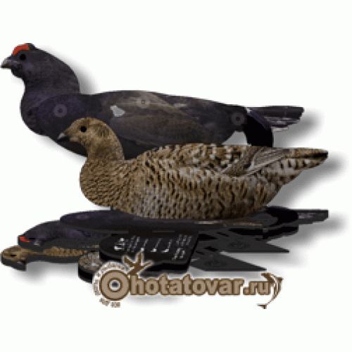 Чучела поставляются в коробках по 6 штук чучел в виде профиля тетерева (3 самки + 3 самца). Чучела тетерева сделаны из неопрена - очень устойчивы к условиям использования (действие воды, грязи, износа, случайного попадания дроби). У чучела тетерева поворачивается голова и хвост, у - тетерки поворачивается голова - каждое чучело может принять индивидуальную позу, создав тем самым реалистичную картину. Муляжи тетерева снабжены металлической стойкой, что позволяет чучела удобно фиксировать в земле и избежать переворачивания на лужах. Чучела относительно стойки могут быть зафиксированы в трех положениях. Муляжи тетерева очень компактно складываются в плоское положение - удобно для хранения и перевозки. В комплект входит специальный пластиковый подвес для чучел (после удачной охоты для трофеев), который крепиться на ремень или верхнюю часть брюк. 2 запасных комплекта пластиковых фиксаторов элементов из которых состоит чучело пригодятся на случай утери. Габариты чучел 17x14x44см. Вес одного чучела тетерева 140 грамм.