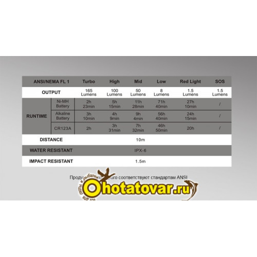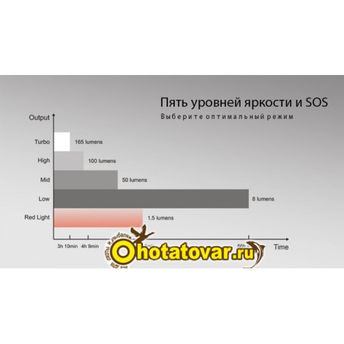 - 3 стандартных яркостных уровня, турборежим, SOS, режим красного света;
