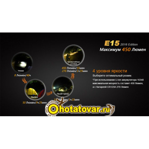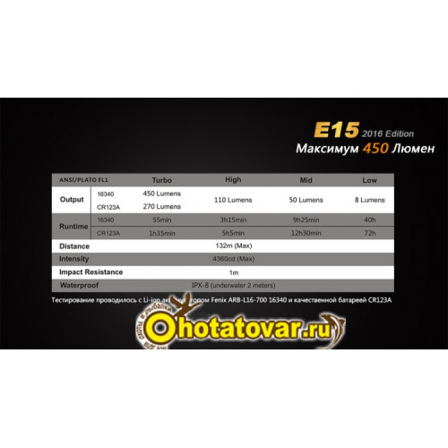 - Turbo: луч 450 люмен яркости (при условии использования аккумулятора 16340) и 55 минут работы до разрядки либо 270 люмен яркости (на батарейке CR123A) и один час 35 минут автономной работы;