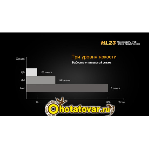 Осветительное устройство работает в 3 режимах. Это режимы High (150 люмен), Mid (50 люмен) и Low (3 люмена). Наиболее экономный из них может использоваться в качестве ночного света в палатке, или чтобы осветить путь непосредственно под ногами. А самый яркий дает комфортный уровень света для решения большинства задач в темное время суток. Время работы Fenix HL23 в каждом из режимов яркости зависит от того, какой элемент питания установлен в его батарейный отсек. Это может быть Ni-MH аккумулятор формата АА или щелочная батарея такого же размера. Время работы от аккумулятора для режимов в порядке убывания яркости такое: 1 ч, 20 мин; 5 ч, 40 мин; 100 ч. А вот параметры работы от щелочной батареи: 1ч; 4 ч, 25 мин; 110 ч.