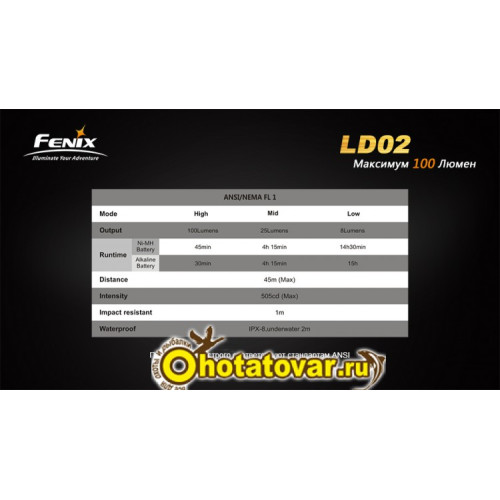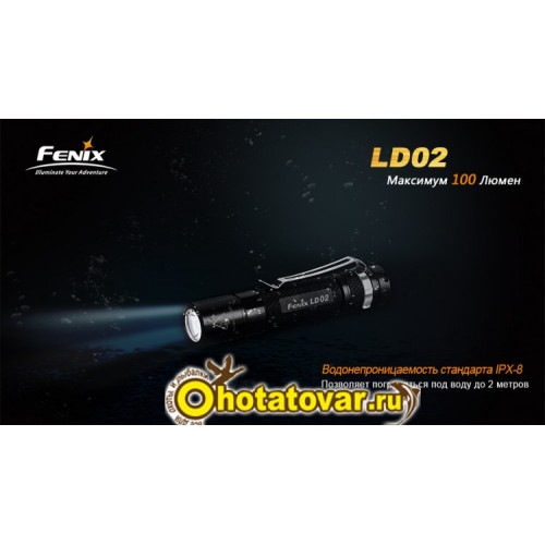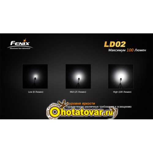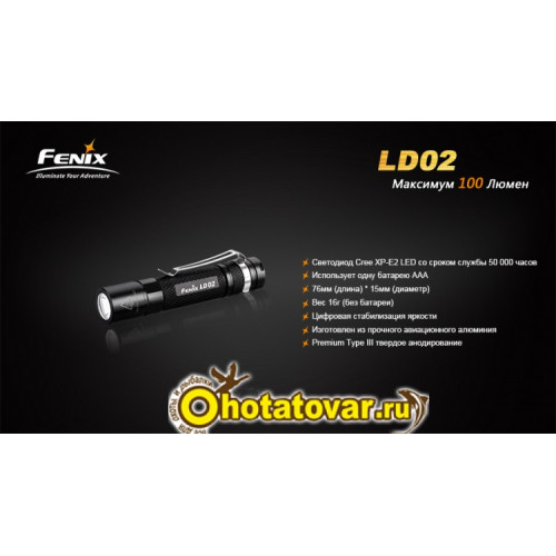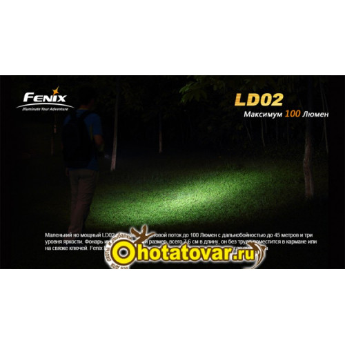 Несмотря на компактность, Fenix LD02 Cree XP-E2 LED подходит для использования как бытовой или туристический фонарь. Максимальная мощность его светового потока — 100 люмен. Устройство работает в 3 режимах: