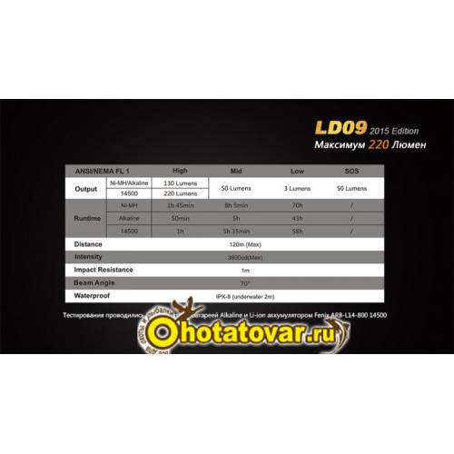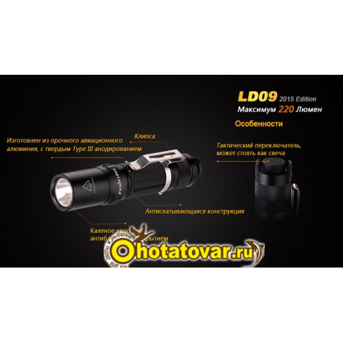 В числе дополнительных преимуществ этой модели механизм стабилизации тока, защита от переполюсовки батареи, гидроизоляция в соответствии с высшим международным стандартом (IPX-8). Корпус Fenix LD09 Cree XP-E2 (R3) LED изготовлен из авиационного алюминия с жестким анодированным покрытием и ромбовидной накаткой, которая препятствует выскальзыванию устройства из рук.
