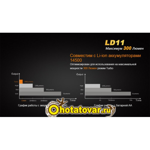 Инструкции по использованию: Фонарь Fenix LD11 работает с различными типами элементов питания. Для него подходят щелочные батарейки, никель-металлгидридные или литий-ионные аккумуляторы размера АА. Этот же формат иногда называют «пальчиковым» или 14500. Однако наиболее яркий режим в данной модели доступен только при условии установки литий-ионного аккумулятора. С другими элементами питания Fenix LD11 будет светить с яркостью вплоть до режима High, для которого она составляет 130 люмен.