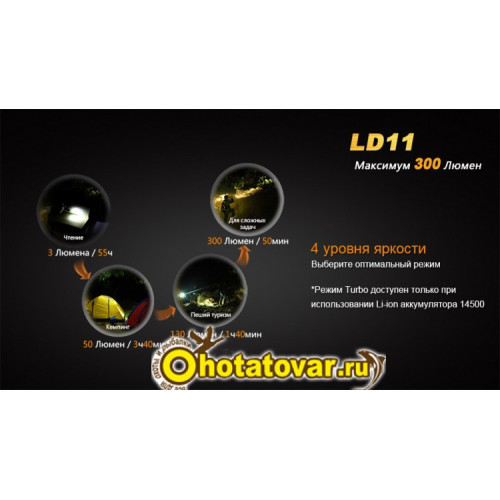 - Turbo режим: 300 лм / 50 мин на литий-ионном аккумуляторе;