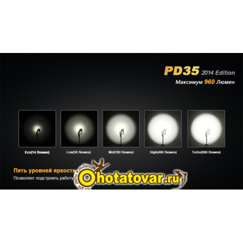 Фонарь PD35 включает 5 режимов работы и стробоскоп.