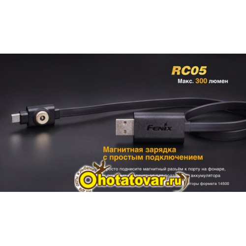 Для поддержания работы RC05 потребуется всего один аккумулятор размера 14500. Если выбрать фирменный элемент питания Fenix на 800 мАч, то его энергии хватит до 40 часов. Также подойдет обычная пальчиковая батарейка (АА). Но производители предупреждают, что режим Turbo доступен только при использовании аккумулятора. Кроме того, в этом режиме фонарь довольно сильно нагревается, и чтобы избежать связанных с этим неисправностей, режим Turbo отключается после 5 минут работы, чтобы фонарик мог немного остыть. После разрядки аккумулятора, его можно заменить новым либ зарядить. В комплекте с фонариком есть специальный кабель, позволяющий зарядить элемент питания 14500 прямо в корпусе фонаря.