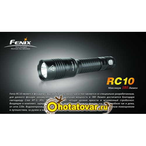 Фонарь Fenix RC10 Cree XP-G (R5) является одной из самых удачных новинок производителя Fenix. Основное отличие от аналогичных моделей компании заключается в том, что фонарь имеет встроенный аккумулятор, который можно заряжать, не вынимая его из корпуса. В модели используется оригинальный аккумулятор ARB-L1 компании Fenix емкостью 2200 мАч и рабочим напряжением 3,6 В. Помимо фонаря и аккумулятора в комплект входят: зарядное устройство для бытовой сети 220В, комплект адаптеров для различных стандартов розеток, адаптер для зарядки от бортовой сети автомобиля, запасное резиновое кольцо. В модели используется современный светодиод XP-G (R5) от американской компании Cree, который отличается значительным ресурсом.