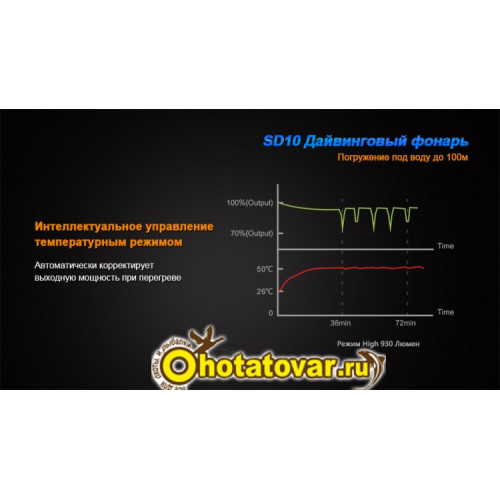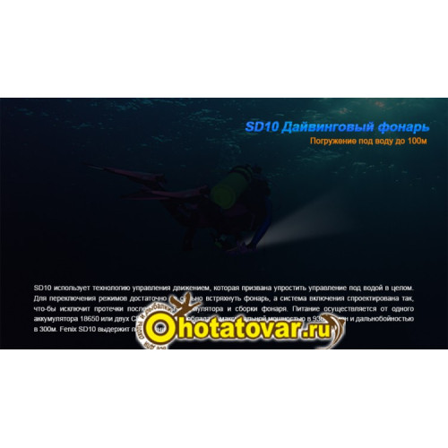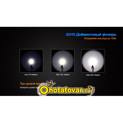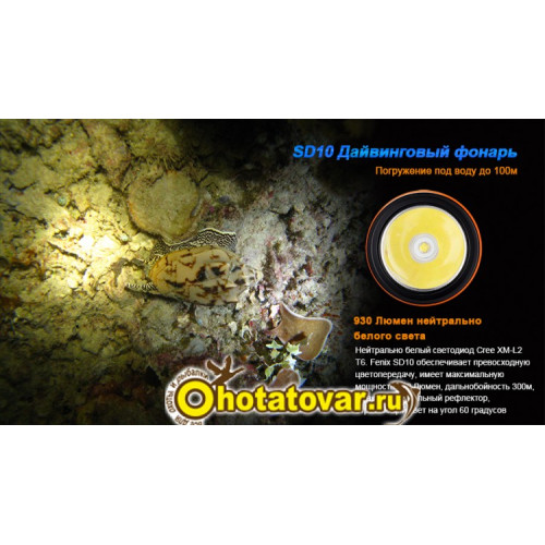 Fenix SD10 Cree XM-L2 (T6) способен светить с яркостью до 930 люмен. В его систему интегрирован светодиод последнего поколения Cree XM-L2. Нейтральный белый оттенок света обеспечивает условия хорошей видимости даже в мутной воде. Дальность луча в этой модели достигает 300 метров. Фонарь работает в 3 режимах яркости:
