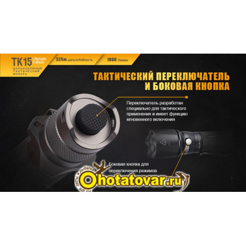 Фонарь TK15UE включается торцевой кнопкой, а за переключение режимов отвечает боковая. Однако управление может делегироваться полностью выносной кнопке, когда фонарь закрепляется к стволу охотничьего оружия. Этот аксессуар приобретается отдельно и выбирать лучше фирменные модели.