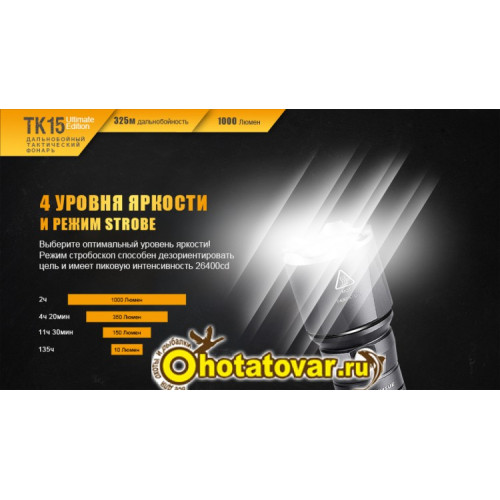 TK15UE поддерживает четыре режима с разной яркостью и один дополнительный — Strobe: