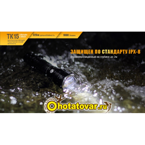 Использовать TK15UE можно в любую погоду, поскольку фонарь не пропускает влагу внутрь корпуса (степень защищенности — IPX-8).