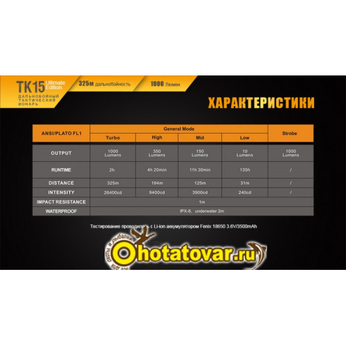 - 1000 люмен — режим работы Turbo (2 часа света от энергии одного аккумулятора);