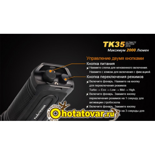 Управление работой Fenix TK35UE (2015) максимально простое и происходит при помощи двух переключателей в хвосте корпуса. Сам же корпус сделан из прочного, но не тяжелого алюминиевого сплава. Поверхность корпуса — анодированная, с рифлеными боковыми зонами, которые дают возможность крепче удерживать фонарь в ладони. Эта оболочка отлично защищает все внутренние механизмы от случайных ударов и падений, а также обеспечивает его полную гидроизоляцию в соответствии с международным стандартом уровня IPX-8. Также длительной и стабильной работе фонаря Fenix TK35UE (2015) способствует наличие систем защиты от перегрева при работе с большой мощностью, от замыканий вследствие переполюсовки аккумуляторов, от переразрядки элементов питания.