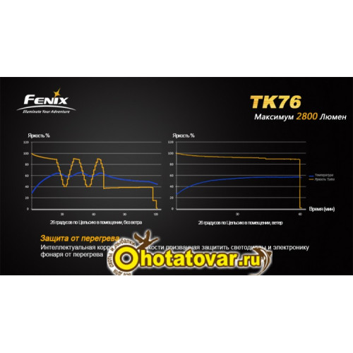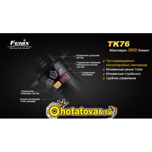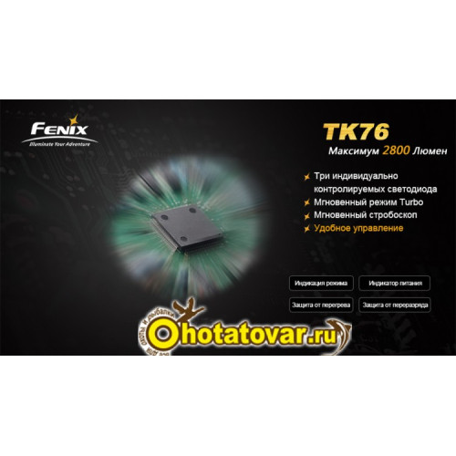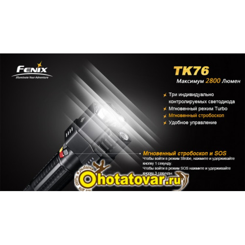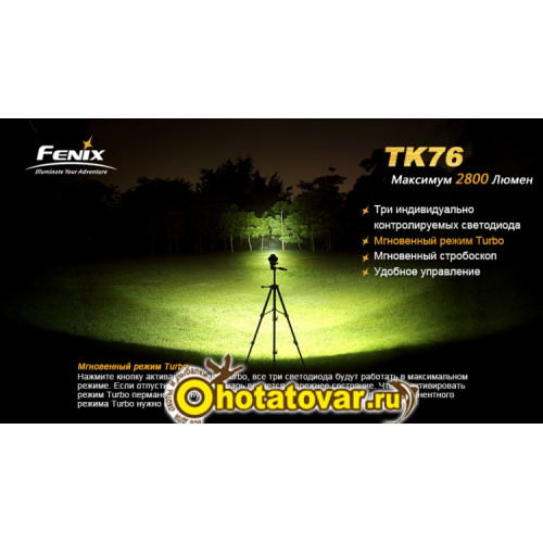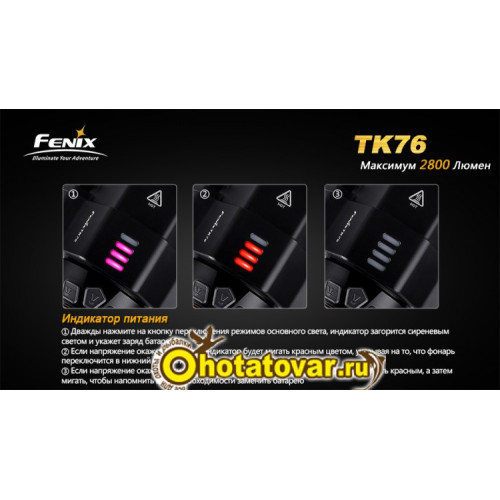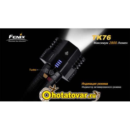 Режим мгновенного турбо-режима активируется нажатием на желтую кнопку со знаком солнца. Все три светодиода будут работать в турбо-режиме до тех пор, пока вы удерживаете кнопку. Как только вы отпустите кнопку, фонарь перейдет в предыдущий режим яркости. Удерживайте кнопку турбо в течение 5 секунд, и фонарь перейдет в режим постоянной работы в турбо-режиме. Нажатие на любую кнопку, кроме кнопки питания, вернет фонарь в предыдущий режим работы. Чтобы выключить фонарь, нажмите на кнопку питания.Купить фонарь Fenix TK76 XM-L2 (U2), XM-L2 (T6) в интернет магазине Охота Товары с гарантией 5 лет от производителя