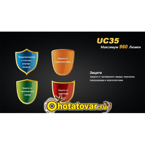 Fenix UC35 оснащен несколькими защитными механизмами, которые делают работу фонаря еще более качественной, а его использование — максимально удобным. В том числе, речь идет о системе запоминания последнего выбранного уровня яркости и автоматического его выбора при следующем включении. Также специальный индикатор предупредит, когда останется менее трети заряда аккумуляторов. Постоянный уровень светового потока гарантирует система цифровой стабилизации тока. А механизм защиты от переполюсовки защитит систему прибора от неправильной установки элементов питания.