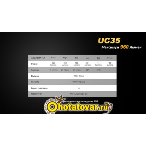 Фонарь Fenix UC35 XM-L2 (U2) ориентирован на туристов, рыбаков и охотников. Именно это и определяет его технические характеристики. В осветительное устройство встроен светодиод Cree XM-L2 (U2) с потенциалом работы более 50 000 часов. Этот современный полупроводниковый прибор американского производства обеспечивает световой поток мощностью до 960 люмен. Фонарь легко настроить под каждую конкретную ситуацию, поскольку он работает в 6 режимах. Среди них 5 различных уровней яркости, в том числе и турбосвет, а также тактический режим стробоскоп. Характеристики света Fenix UC35 такие:Описание фонаря Fenix UC35 XM-L2 (U2):