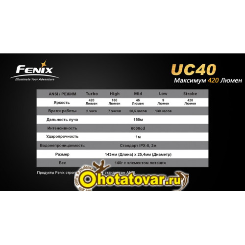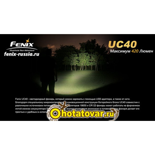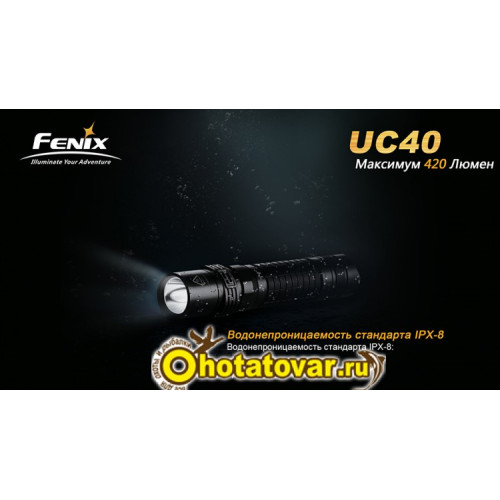 Также Fenix UC40 соответствует стандарту водонепроницаемости IPX-8. Фонарь будет работать под водой на глубине 2 метров. Fenix UC40 поможет вам в любой непредвиденной ситуации; фонарь подойдет для повседневного использования, а также поможет чувствовать себя увереннее в туристической походе или на рыбалке.