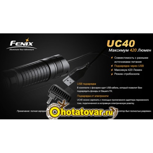 Прочность и надежность - отличительная черта фонарей Fenix. UC40 изготовлен из авиационного алюминия с антиабразивным покрытием (анодирование III степени) - это обеспечивает защиту при падениях фонаря.