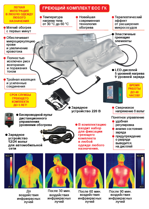 Использование греющего комплекта расширяет температурный диапазон использования одежды при низких температурах и создает комфортный тепловой режим для человека.