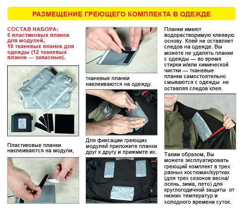 Греющий комплект может интегрироваться в любую одежду любого назначения. Таким образом любая одежда может быть модифицирована в одежду с подогревом - одежда с подогревом своими руками.
