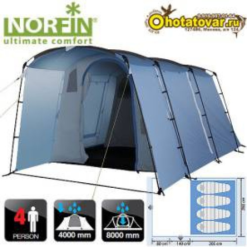 Кемпинговая 4-х местная палатка для туризма Norfin Family Malmo 4 снабжена большим тамбуром купольного типа. Большая спальня, просторный тамбур с большим прозрачным окном дают ощущение домашнего комфорта в природных условиях. Купить четырехместную палатку Norfin Family Malmo можно в магазине ohotatovar.ru.