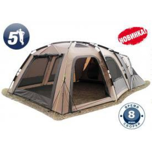 Без туристической палатки настоящему туристу и поклоннику активного отдыха было бы нелегко. Современная кемпинговая палатка легка в использовании, собрать ее можно всего за восемь минут. Эта палатка вмещает 5 человек, есть специализированное отделение для сна, сделана из современного дышащего и водостойкого материала, пропускающий воздух. Дуги сделаны из прочного алюминия, шпильки из пластика. Цвет — не маркий и прекрасно подходит для постоянных поездок. В комплектацию входит палатка, тент и упаковочная сумка, есть москитная сетка. Палаточная конструкция практична и удобна в эксплуатации