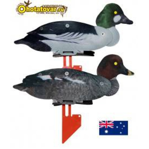 Чучела уток сделаны из неопрена - очень устойчивы к условиям использования (действие воды, грязи, случайного попадания дроби), неопрен легко держится на воде. У чучел утки и селезня поворачивается голова - каждое чучело может принять индивидуальную позу, создав тем самым реалистичную картину. Муляжи утки снабжены металлической стойкой, что позволяет чучела удобно фиксировать в земле и избежать переворачивания на воде (как ни бросает чучело волнами оно остается в рабочем положении). Чучела относительно стойки могут быть зафиксированы в трех положениях. Муляжи утки очень компактно складываются в плоское положение - удобно для хранения и перевозки. В комплект входит специальный пластиковый подвес для чучел (после удачной охоты для трофеев), который крепиться на ремень или верхнюю часть брюк. Запасной комплект пластиковых фиксаторов элементов из которых состоит чучело пригодятся на случай утери. В комплекте есть тяжелые якоря для фиксирования чучел на одном месте (чучела не будет гонять волной и ветром) и веревка для подвязывания якорей к муляжам. Габариты чучел 17x14x44см. Вес одного чучела уток 230 грамм.