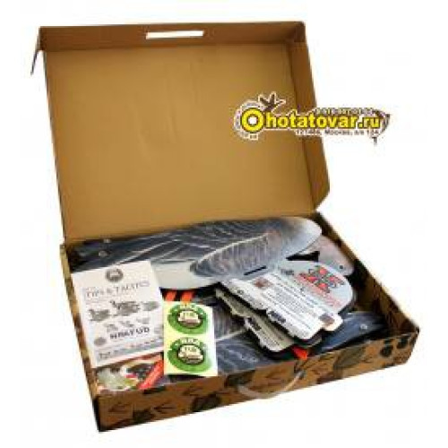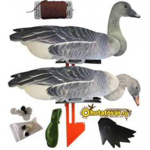 Чучела поставляются в коробках по 6 штук чучел в виде профиля гуся гуменника (3 гуся сторожевых и 3 гуся плывущих). Чучела гуся гуменника сделаны из неопрена - очень устойчивы к условиям использования (действие воды, грязи, износа, случайного попадания дроби). Муляжи гуся гуменника очень компактно складываются в плоское положение - удобно для хранения и перевозки. У чучел гуся поворачивается голова - каждое чучело может принять индивидуальную позу, создав тем самым реалистичную картину. Муляжи гуся снабжены металлической стойкой, что позволяет чучела удобно фиксировать в земле и избежать переворачивания на воде (как ни бросает чучело волнами оно остается в рабочем положении). Чучела относительно стойки могут быть зафиксированы в трех положениях. Муляжи гуся очень компактно складываются в плоское положение - удобно для хранения и перевозки. В комплект входит специальный пластиковый подвес для чучел (после удачной охоты для трофеев), который крепиться на ремень или верхнюю часть брюк. Запасной комплект пластиковых фиксаторов элементов из которых состоит чучело пригодятся на случай утери. В комплекте есть тяжелые якоря для фиксирования чучел на одном месте (чучела не будет гонять волной и ветром) и веревка для подвязывания якорей к муляжам. Габариты чучел 28x19x58см. Вес одного чучела гуся 440 грамм.