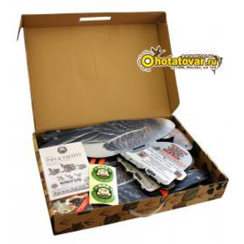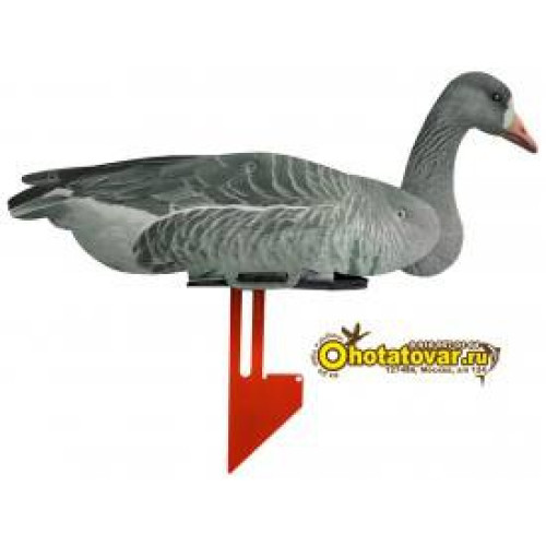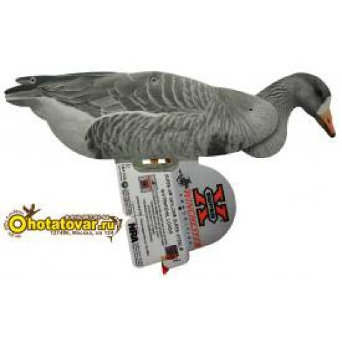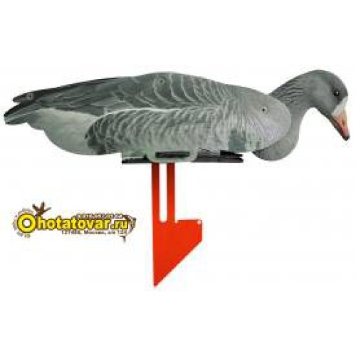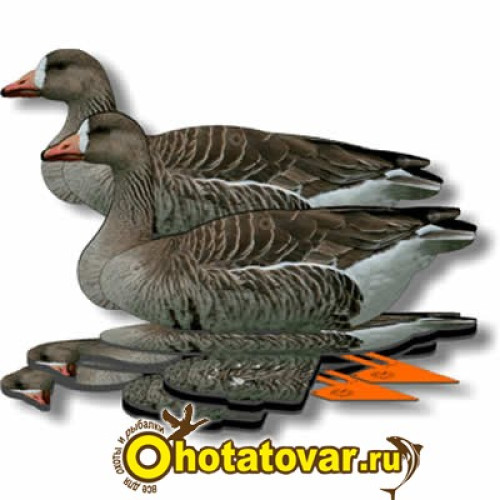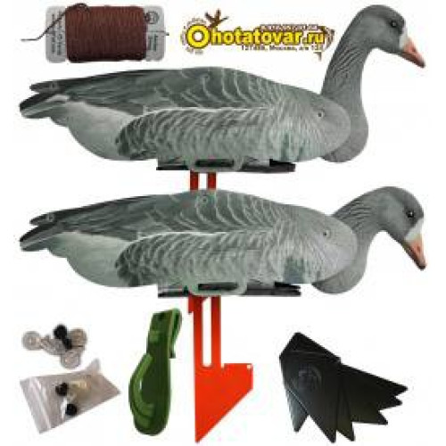 Чучела поставляются в коробках по 6 штук чучел в виде профиля белолобого гуся (3 гуся сторожевых и 3 гуся плывущих). Чучела белолобого гуся сделаны из неопрена - очень устойчивы к условиям использования (действие воды, грязи, износа, случайного попадания дроби). Муляжи белолобого гуся очень компактно складываются в плоское положение - удобно для хранения и перевозки. У чучел гуся поворачивается голова - каждое чучело может принять индивидуальную позу, создав тем самым реалистичную картину. Муляжи гуся снабжены металлической стойкой, что позволяет чучела удобно фиксировать в земле и избежать переворачивания на воде (как ни бросает чучело волнами оно остается в рабочем положении). Чучела относительно стойки могут быть зафиксированы в трех положениях. Муляжи гуся очень компактно складываются в плоское положение - удобно для хранения и перевозки. В комплект входит специальный пластиковый подвес для чучел (после удачной охоты для трофеев), который крепиться на ремень или верхнюю часть брюк. Запасной комплект пластиковых фиксаторов элементов из которых состоит чучело пригодятся на случай утери. В комплекте есть тяжелые якоря для фиксирования чучел на одном месте (чучела не будет гонять волной и ветром) и веревка для подвязывания якорей к муляжам. Габариты чучел 28x19x58см. Вес одного чучела гуся 440 грамм.