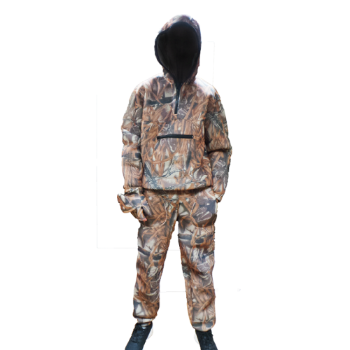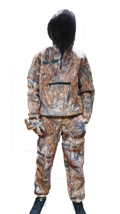Костюм антимоскитный состоит из трёх аксессуаров: куртка, брюки, перчатки. Изделие предназначено для защиты человека от вредных насекомых (комары, мошка, москиты, клещи и др.) Не заменим для охотников в жаркую погоду (охота на лабазе), рыбаков, дачников, лесников, геологов, нефтяников и др. Абсолютная воздухопроницаемость. Крой изделия свободный и не сковывает движения человека. Капюшон оснащен отстёгивающейся сеткой чёрного цвета, которая обеспечивает чёткую видимость в любое время суток. На куртке пришит карман для хранения перчаток и других вещей. Манжеты рукавов, штанин, пояс брюк и низ куртки снабжены резинками. По бокам у штанов есть врезные карманы. Брюки фиксируются на талии с помощью вмонтированной резинки и дополнительной шнуровки. Перчатки сделаны с "обрезными пальцами", которые можно закрыть с помощью откидывающейся варежки (фиксируется на липучку). Костюм сделан из сетчатого трехслойного переплетения ткани из 100% полиэстера (материал не боится воды - не гниёт).