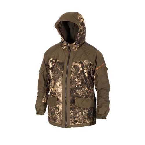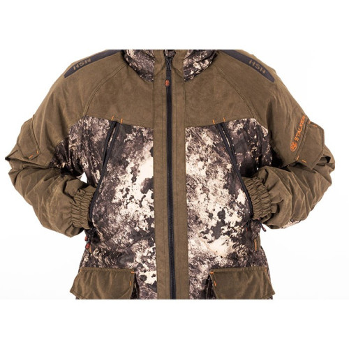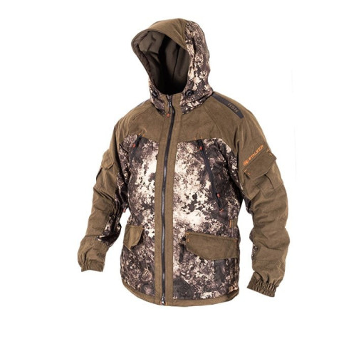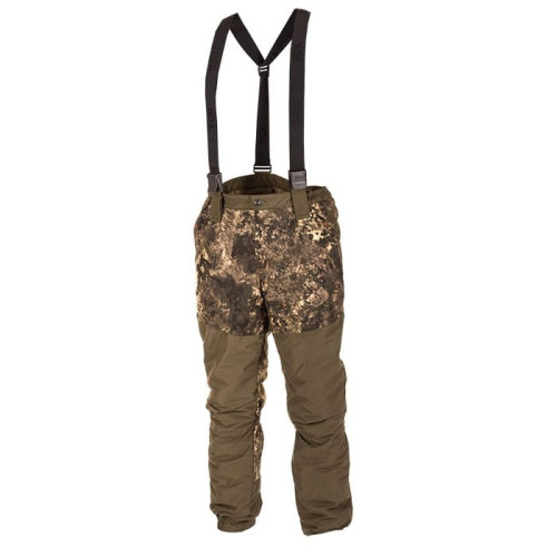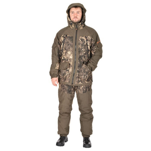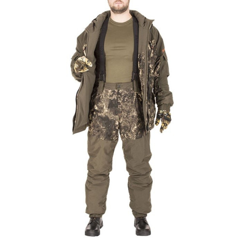 Костюм состоит из куртки и брюк на съемных подтяжках. Отличается специальным анатомическим кроем. Он не стесняет движений. Плечи и зона седалища дополнительно усилены бесшумной мембранной тканью Canada 10 000 мм / 10 000 г/м кв..