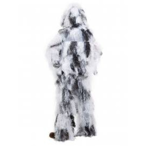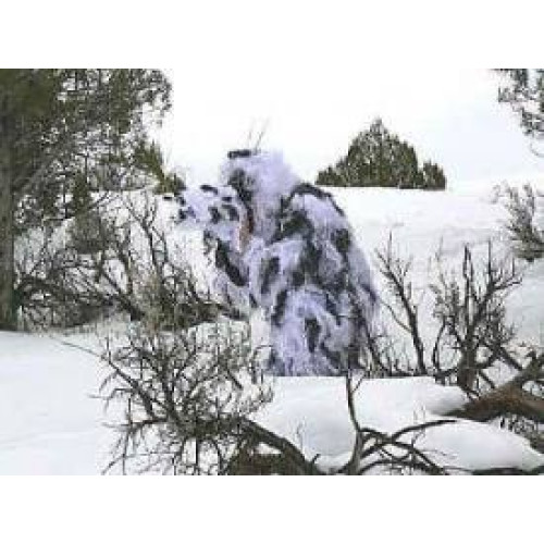 Маскировочный костюм Ghillie производства фирмы MIL-SPEC. Цвет - WHITE (белый). Предназначен для маскировки в зимний период, в условиях снежного покрова.Легкий маскировочный костюм из синтетической сетчатой ткани с большим количеством нашитой по всех поверхности костюма бахромы из синтетической нити. Костюм отлично "размывает" фигуру человека, хорошо "дышит", плохо впитывает влагу, не имеет запаха и не вызываете аллергию, устойчив к воздействию плесени и гниению, не шуршит и не бликует. Костюм состоит из куртки, съемного капюшона и брюк. Также в комплект входит полоска камуфлированной ткани с нашитой бахромой для обертывания ружья. Упакован в рюкзак-чехол из камуфлированной ткани с лямкой для переноски на плече. Куртка имеет центральную застежку на пуговицы. Брюки утягиваются по талии и имеют застежку на пуговицы в нижней части. Капюшон имеет сетку, закрывающую лицо.
