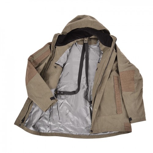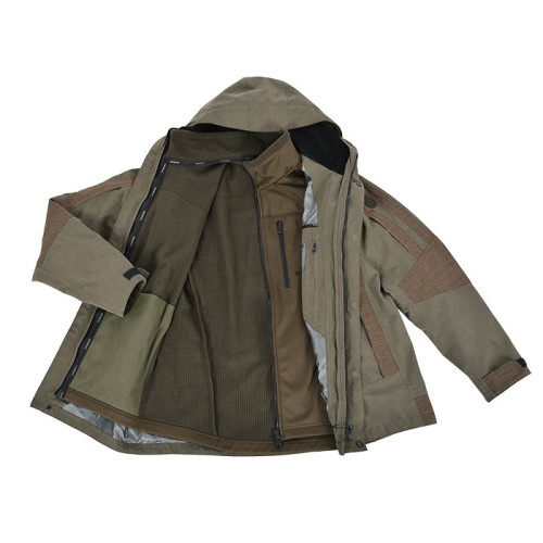- Костюм состоит из куртки третьего слоя (ткань Gamma + SHIELD-TEX с кевларовым усилением на локтевых и коленных зонах);