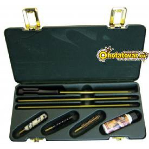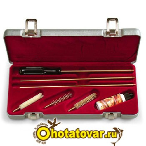 Универсальный набор для чистки нарезного оружия калибра 7.62 в прочном подарочном кейсе из пластика с металлическими петлями и замками. Внутри пенал для содержимого и мягкая подкладка для фиксации. Набор состоит из трех-секционного шомпола из латуни с вращающейся ручкой (длина - 79см.), медного ершика (длина - 6,5см), синтетического ершика (длина - 6,5см), пуховки из ветоши (длина - 6,5см), флакончика оружейного масла для защиты от коррозии и смазки стволов (объем - 25мл).