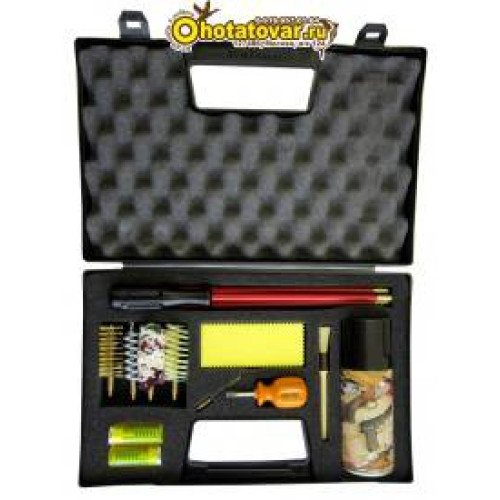 Оптимальный набор для чистки гладкоствольного оружия 12 калибра в прочном подарочном кейсе. Внутри пенал для содержимого и мягкая подкладка для фиксации. Набор состоит из трех-секционного шомпола из металла покрытого пластиком (длина - 82см.), ручка шомпола вращается, стального вишера (длина - 7,5см), медного ершика (длина - 6,5см), синтетического ершика (длина - 7см), пуховки из ветоши (длина - 7,5см), петли для тампонов (длина - 6см), двух фальпатронов из пластика, кисточки для очистки внешних частех оружия, 8 салфеток из плотной ветоши, отвертки, флакона оружейного масла для защиты от коррозии и смазки стволов (объем - 125мл).