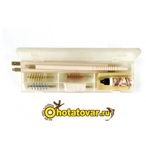 Набор для чистки Stil Crin в пласт. прозр. футляре, (дерев. шомпол) к.12. Набор для чистки в пластиковом прозрачном футляре для 12 калибра. Данный набор поможет очистить канал ствола от грязи, нагара и ржавчины.