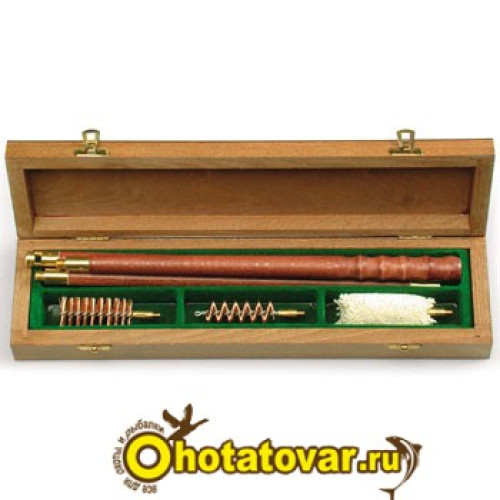 Набор для чистки гладкоствольного оружия 12 калибра в красивом деревянном футляре из мореного и лакированного дерева с деревянным шомполом из лакированного и мореного ореха.