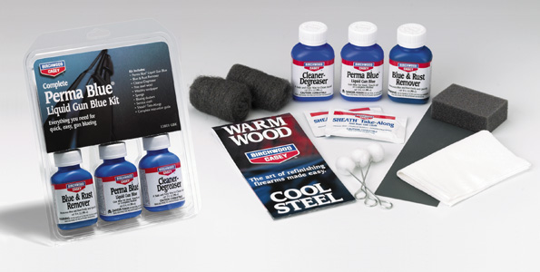 В набор входит: Состав для удаления старого воронения и ржавчины - Blue & Rust Remover (90 мл), жидкость для воронения - Perma Blue (90 мл), очиститель-обезжириватель - Cleaner-Degreaser (90 мл), мелкозернистая шкурка, абразивная ткань, губка, ватные тампоны, салфетки, состав для защиты от коррозии - Barricade.