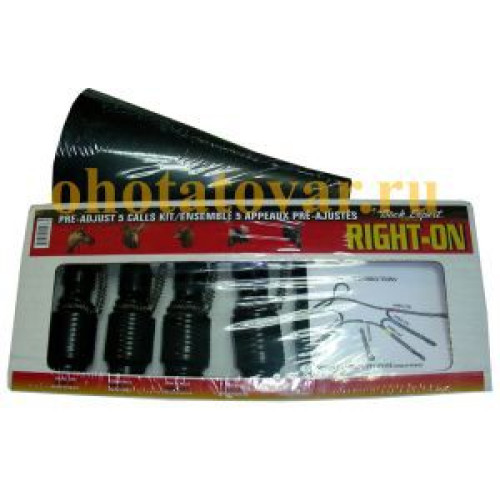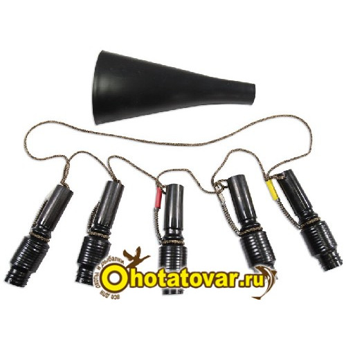 Комплект из 5 манков набора настроен, воспроизводить один конкретный звук самки или самца лося: 1. молодая самка, 2. молодой самец, 3. призывный звук самки, 4. крик взрослого самца, 5. крик взрослой самки. Каждый манок имеет свой отдельный подвес. В набор входит раструб: если потереть зубчатый край усилителя/раструба о дерево, то получите имитацию звука трения лосиных рогов о дерево.