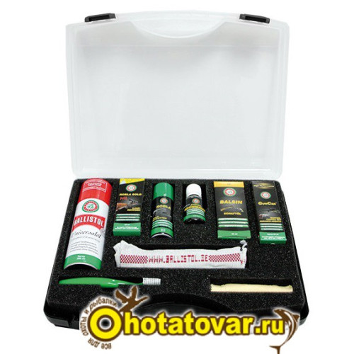 Набор средств для уходу за оружием Ballistol Set - состоит из 9 вещей. Ballistol (аэрозоль) - универсальное многоцелевое масло. Предназначено для очистки и защиты поверхностей металлов, кожи, натурального дерева. Ухаживая за оружием, удаляет налет свинца и меди со стволов и патронников огнестрельного оружия, защищает деревянные части оружия, очищает, пропитывает изделия из кожи, нейтрализует и удаляет кислотные осадки от пороха. Растворяется водой, не твердеет, не приобретает свойств смолы. Ballistol Robla Solo (жидкость) - средство для очистки каналов стволов оружия. Практичный и простой в применении очиститель стволов оружия Robla Solo обладает превосходной эффективностью. Очищенные стволы улучшают показатели стрельбы и продлевают срок эксплуатации. Очиститель из специального состава на основе аммиака, удаляющего остатки свинца, меди, томпака и цинка. Абсолютно безвредно для стали, хрома и никеля, которые используются для изготовления оружия; Ballistol Robla Kaltentfetter (аэрозоль) - средство для удаления смазки и обезжиривания поверхности. Обезжиривающее средство на 100% очищает оружие и другие металлические предметы, удаляет налипшие масла, жиры, въевшуюся грязь. Идеально подходит для обработки ствола перед воронением. После применения поверхность высушить. В зависимости от степени загрязнения возможна многократная обработка. При крайне сильном загрязнении сначала удалить крупную грязь куском ткани. Очень практичен для чистки тормозов и тормозных дисков; Ballistol Balsin Schaftol - масло для ухода и реставрации деревянных частей: приклада, цевья. Средство для обработки дерева Balsin Schaftol придает элементам оружия из дерева первоначальный лоск и красоту, защищая от воздействия влаги. Подходит для любого вида древесины. Защищает древесины от гниения за счет формулы схожей с силиконом. Рекомендован для защиты нелакированной древесины. 3 варианта цвета: светлый оттенок, красно-коричневый и темно-коричневый. Для придания лоска и блеска рекомендуется использовать светлый оттенок; красно-коричневый подойдет для устранения дефектов (царапин, сколов); темный оттенок практически заменяет краску, придавая древесине совершенно другой оттенок; Ballistol Klever - средство для нанесения на оружие воронения или его восстановления. Превосходно для восстановления защитного воронения стволов, помогает скрыть царапины и потертости, защищая металл от коррозии и старения, продлевает срок службы главных элементов оружия - стволы; Ballistol Gunex (аэрозоль) - масло для улучшенной защиты от загрязнений после выстрелов. Разработано для высоких требований армии и стрелков-спортсменов! Удаляет остатки пороха, томпака и дыма, а также непригодные масла и загрязнения. Поддерживает скольжение всей механики, не затвердевает и не склеивает. Обладает очень хорошей ползучестью и хорошими смазочными свойствами. Идеально для ухода и технического обслуживания охотничьего и спортивного оружия, пистолетов, револьверов и сигнального оружия. Долгосрочная защита частей оголённого металла, даже при крайне неблагоприятных условиях (от -50°С до 100°С). Это масло проникает в область между металлом и влагой, проникает в тончайшие трещинки, очищает от загрязнений, сохраняет поверхности гладкими; Ballistol Sucolin - универсальная оружейная пакля для чистки оружия любых калибров и других поверхностей. Для чистки оружия необходим 