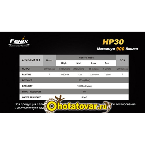 Гарантия: Компания предоставляет гарантию сроком на 5 лет со дня приобретения фонаря Fenix HP30 CREE XM-L2.