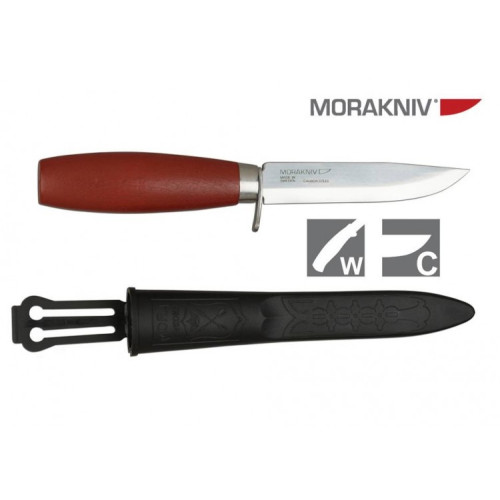 Надёжный нож, который всегда находится среди инструментов ремесленников. Также его в своей работе применяют плотники. Клинок изготовлен из углеродистой стали, рукоятка из прочной березы красного цвета. Ножны, входящие в комплект, отлично выполняют 2 свои главные функции: удобное ношение и предохранение от травм, повреждений клинка. Кто-то скажет - что его нож никогда не наносил ему вреда - на это ответ очень простой – зачем вообще таскать с собой нож настолько тупой, что он не представляет опасности в обнаженном виде. Специальный фиксатор внутри ножен не даст возможности грохотать клинку в ненужный момент и не позволит покинуть ножны клинку без Вашего желания и участия, поэтому Вы не столкнетесь с проблемой «вот оно было - и нет», даже если будете продираться через чащобу, «плыть» в глубоком снегу или свалитесь в воду. Чтобы освободить нож достаточно его немного потянуть до характерного щелчка, который скорее не слышен уху, а ощутим руке. Компания "Mora" проанализировала историю ношения ножей и пришла к выводу самым разумным является размещение ножа на ремне(на поясе). Если бы было иначе, то размещение на ремне не было бы самым распространенным. Ушко для крепления на ремень позволит надежно закрепить клинок, а главное избавит Вас от необходимости расстегивать и снимать ремень, чтобы освободить нож(каждый знает как приятно возиться под курткой в мороз с ремнями, шнурками и застежками). Современный термопластик ножен устойчив к низким температурам, соленой воде и долгому воздействию воды (что не скажешь о кожаных ножнах, которые надо сушить). Дизайн выполнен с учетом необходимой очистки и промывки ножен после загрязнения(отверстие снизу для удаления воды, гладкая поверхность).