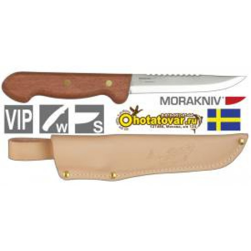 Это популярный классический рыболовный нож с 50-летней историей производства. Лезвие ножа имеет зубчатый обух для чистки рыбы. Лезвие изготовлено из холоднокатанной нержавеющей стали "Sandvik". «Sandvik» - шведская сталь марки "12C27" содержит 0,6% углерода и 13,5% хрома. Уникальная твердость 52-60HRC по Роквеллу достигается закалкой жидким азотом при температуре -80°C. Для предотвращения коррозии, ржавчины в сталь добавлен хром 13-18%, а для дополнительной твердости еще добавляют углерод 0,4-0,7%. У ножа очень прочная и удобная рукоятка из красного дерева "Bubinga". Ножны, входящие в комплект, отлично выполняют 2 свои главные функции: удобное ношение и предохранение от травм, повреждений клинка. Кто-то скажет - что его нож никогда не наносил ему вреда - на это ответ очень простой – зачем вообще таскать с собой нож настолько тупой, что он не представляет опасности в обнаженном виде. Специальный дизайн ножен не даст возможности грохотать клинку в ненужный момент и не позволит покинуть ножны клинку без Вашего желания и участия, поэтому Вы не столкнетесь с проблемой «вот оно было - и нет», даже если будете продираться через чащобу, «плыть» в глубоком снегу или свалитесь в воду. Чтобы освободить нож достаточно его немного потянуть. Компания "Mora" проанализировала историю ношения ножей и пришла к выводу самым разумным является размещение ножа на ремне(на поясе). Если бы было иначе, то размещение на ремне не было бы самым распространенным. Ушко для крепления на ремень позволит надежно закрепить клинок, а главное избавит Вас от потери любимого ножа(снимается только при расстегивании ремня, ножны на шлевке из натуральной кожи). Комбинация натуральной кожи с теснением(лосось) и пластикового вкладыша(внутри) делают ножны одновременно устойчивыми к большим отрицательным температурам и износу от острого клинка. Это классика среди ножен - только ножи из кожи обладают самым низким уровнем шума, что несомненно очень важно для охотников.
