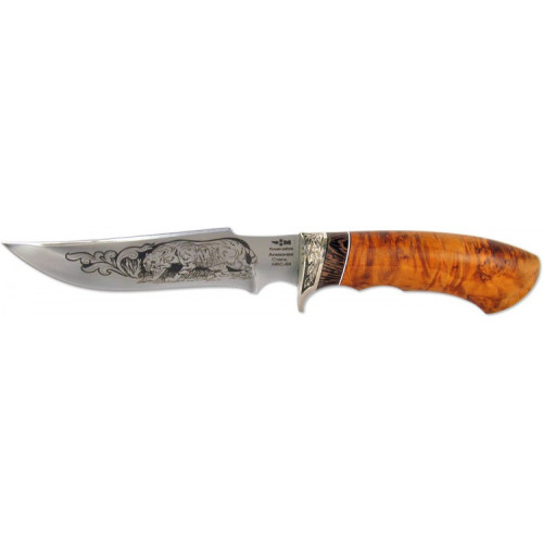 Этот нож выкован в Нижегородской области из алмазной стали - сталь ХВ5. На клинке имеется оригинальный узор или рисунок ручной работы, обнажающий металлическую структуру. Клинок имеет толщину 2,4 мм и закалку до твердости 64-68HRC, что придаёт ему хорошие рабочие характеристики и превосходную режущую способность, но не забывайте, что такая твердость металла увеличивает его хрупкость, нож должен использоваться по назначению. Рукоять ножа исполнена из ценных пород дерева и художественного литья из мельхиора или латуни. Нож комплектуется ножнами из натуральной кожи. Нож КАРДИНАЛ (7832)а является прекрасным экспонатом в коллекции и отличным спутником в арсенале любителя охоты и рыбалки. Приобретая нож, произведенный в России, вы можете быть уверены, что он будет служить вам долгие годы при правильном его использовании.