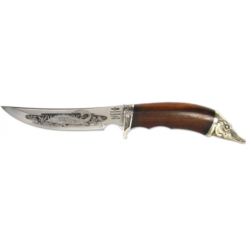 Этот нож выкован в Нижегородской области из алмазной стали - сталь ХВ5. На клинке имеется оригинальный узор или рисунок ручной работы, обнажающий металлическую структуру. Клинок имеет толщину 2,4 мм и закалку до твердости 64-68HRC, что придаёт ему хорошие рабочие характеристики и превосходную режущую способность, но не забывайте, что такая твердость металла увеличивает его хрупкость, нож должен использоваться по назначению. Рукоять ножа исполнена из ценных пород дерева и художественного литья из мельхиора или латуни. Нож комплектуется ножнами из натуральной кожи. Нож РЫБАЦКИЙ (7024)а является прекрасным экспонатом в коллекции и отличным спутником в арсенале любителя охоты и рыбалки. Приобретая нож, произведенный в России, вы можете быть уверены, что он будет служить вам долгие годы при правильном его использовании.