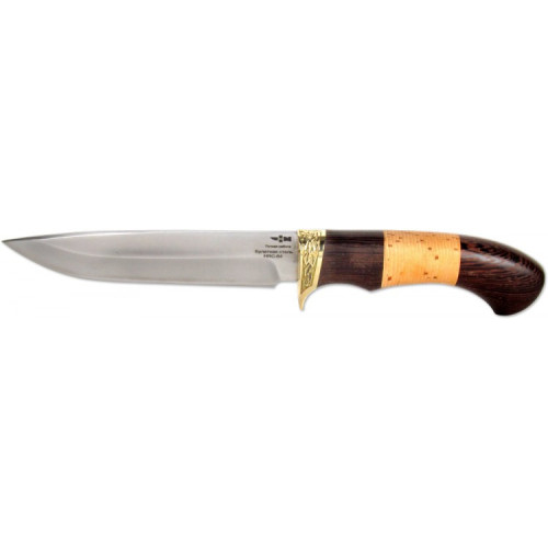 Рукоять выполнена наборным способом из традиционных материалов: дерево венге и береста. Ручка ножа снабжена декоративной оковкой-полугардой из латуни. Наличие этого элемента делает использование ножа более безопасным.