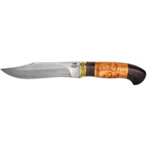 Рукоять ножа выполнена наборным способом из карельской березы, дерева венге, латуни. Латунная оковка, помимо основной функции, выполняет также декоративную функцию – делает нож более элегантным и стильным.