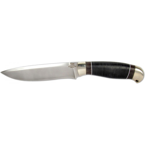 Эргономичная рукоять изготовлена из кожаных элементов, которые пропитаны специальным составом и насажены на хвостовик наборным способом. Рукоятки из кожи, по мере использования, принимают форму руки, что очень удобно при работе на морозе или удерживании ножа мокрой рукой. Рукоятка декорирована оковкой и тыльником, которые изготовлены из латуни. Тыльник имеет темлячное отверстие.