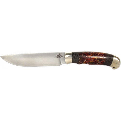 Традиционный охотничий нож, выполненный по мотивам северных русских ножей. Клинок этой модели изготовлен из легендарной булатной стали, которая куется мастерами ручным способом. Клинок имеет прямую форму с небольшим понижением обуха.